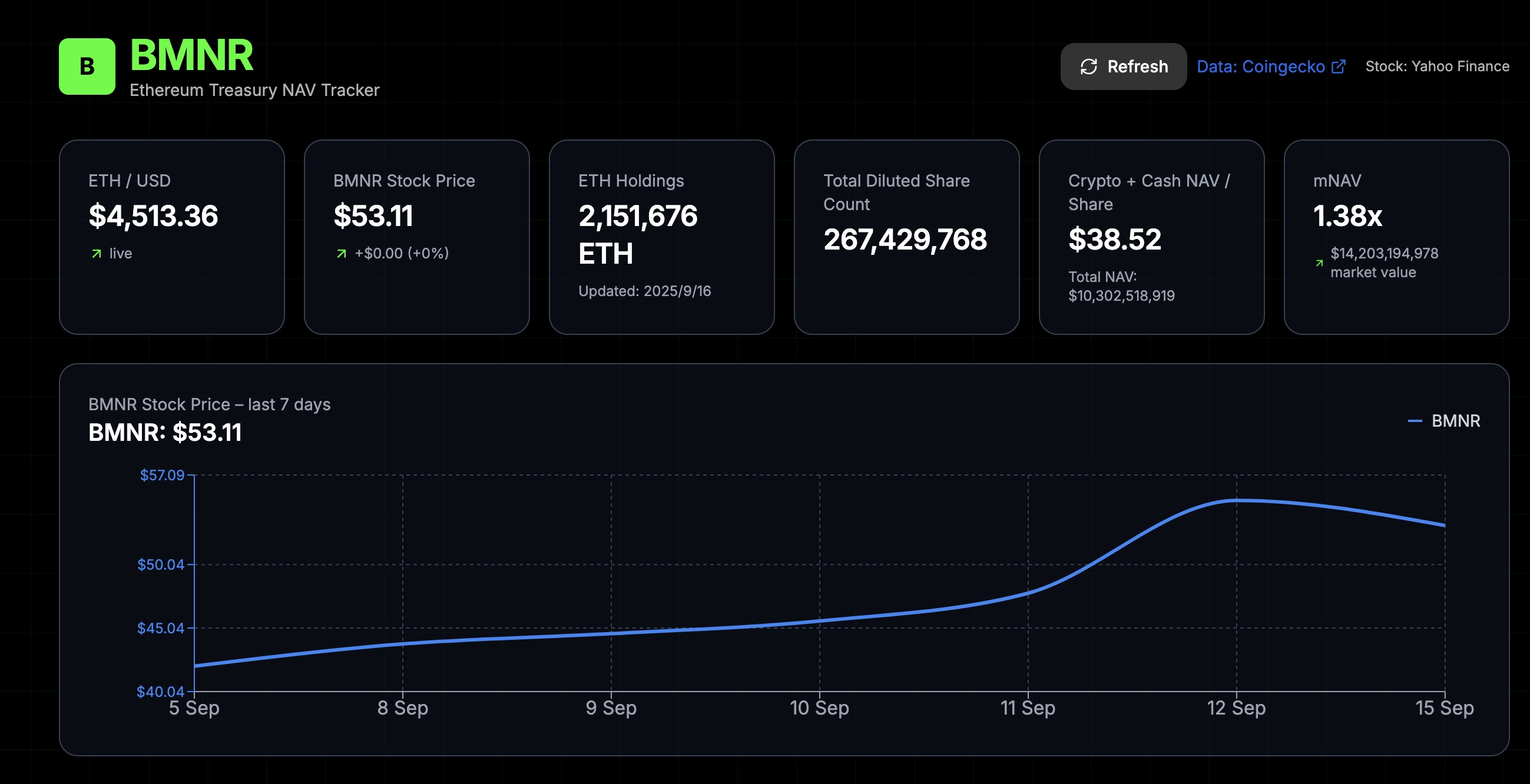 最近发现一个专门追踪 BMNR 以太坊持有量和 mNAV 变化的网站,很实用!